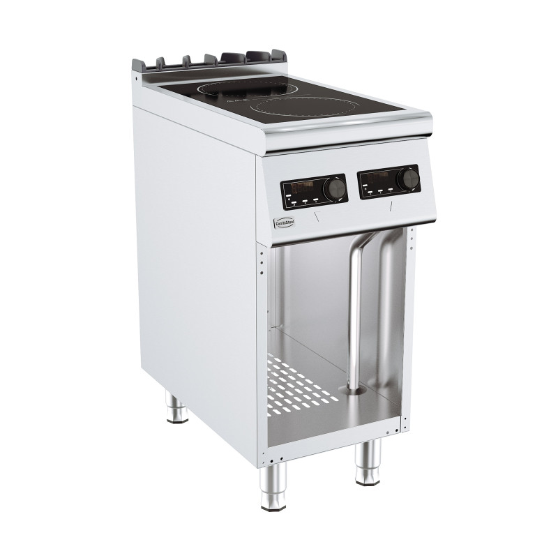 This stainless steel 18/10 glass ceramic range has 4 radiant zones and an open base.