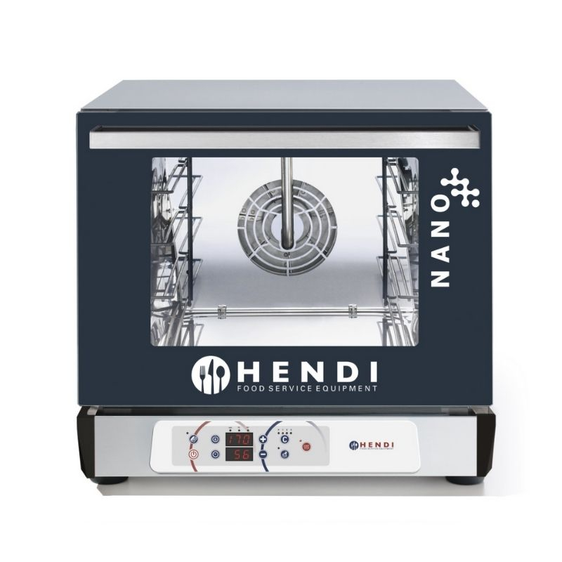 Avec ses dimensions compactes (630 mm de longueur, 730 mm de profondeur et 670 mm de hauteur) et un poids de 58,2 kg, il est parfaitement adapté aux espaces de travail restreints tout en offrant une capacité suffisante grâce à ses cinq niveaux GN 2/3 (354 x 325 mm chacun). Sa plage de température, allant de 50°C à 280°C, permet une grande diversité de cuissons, de la basse température aux cuissons intenses.